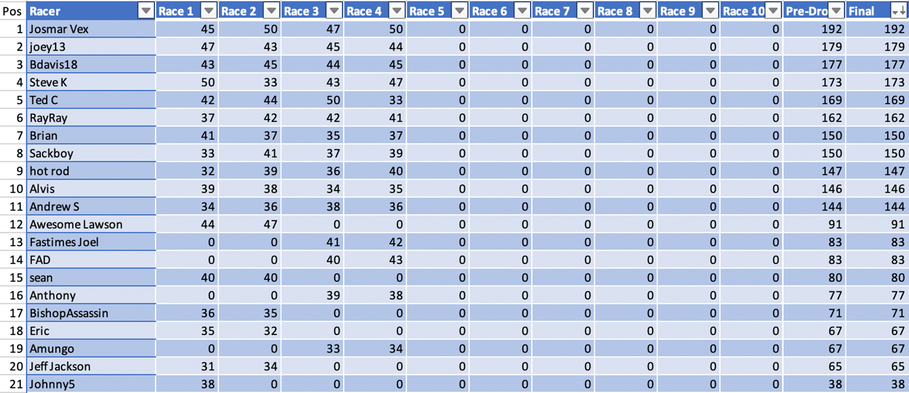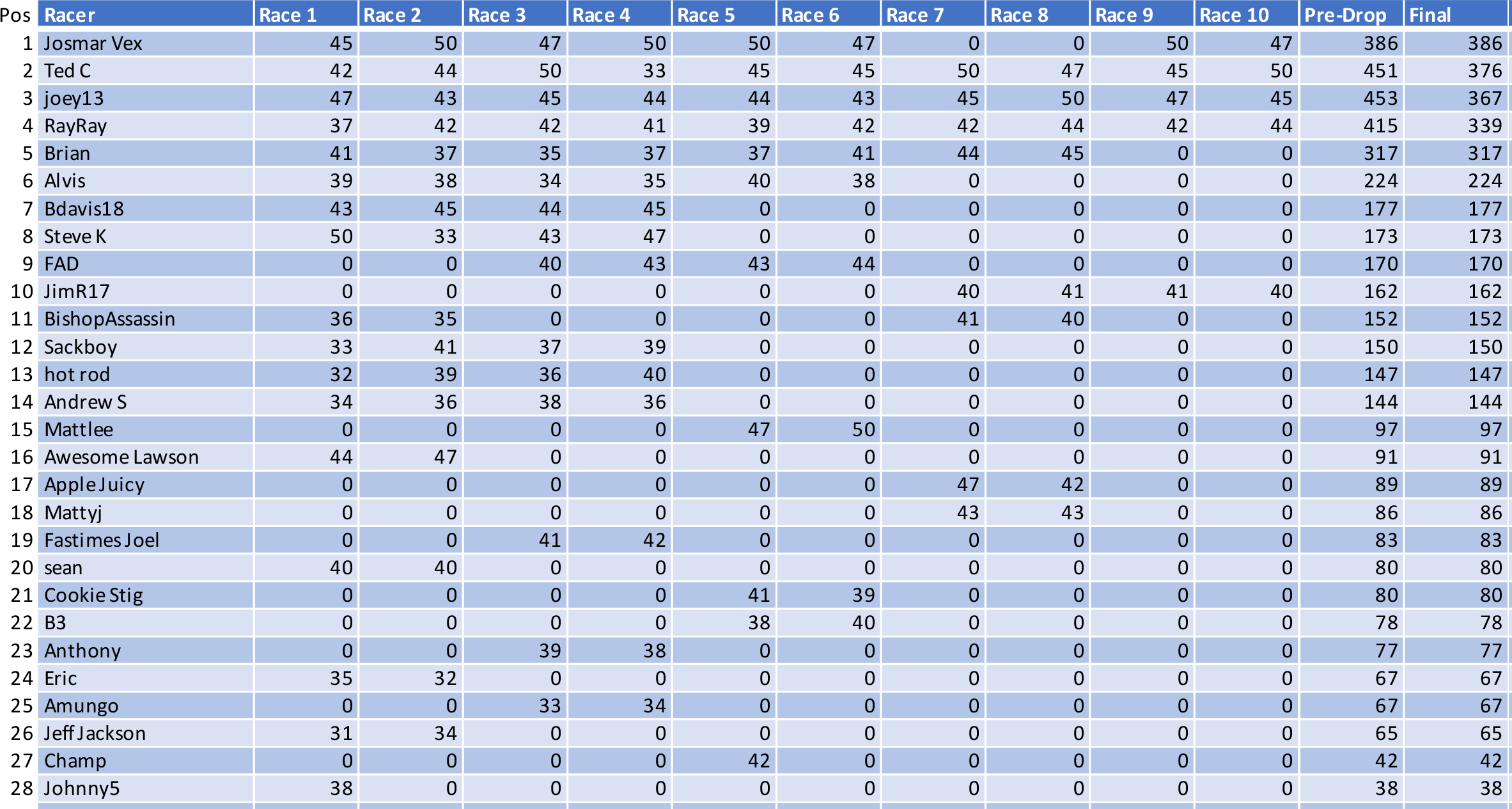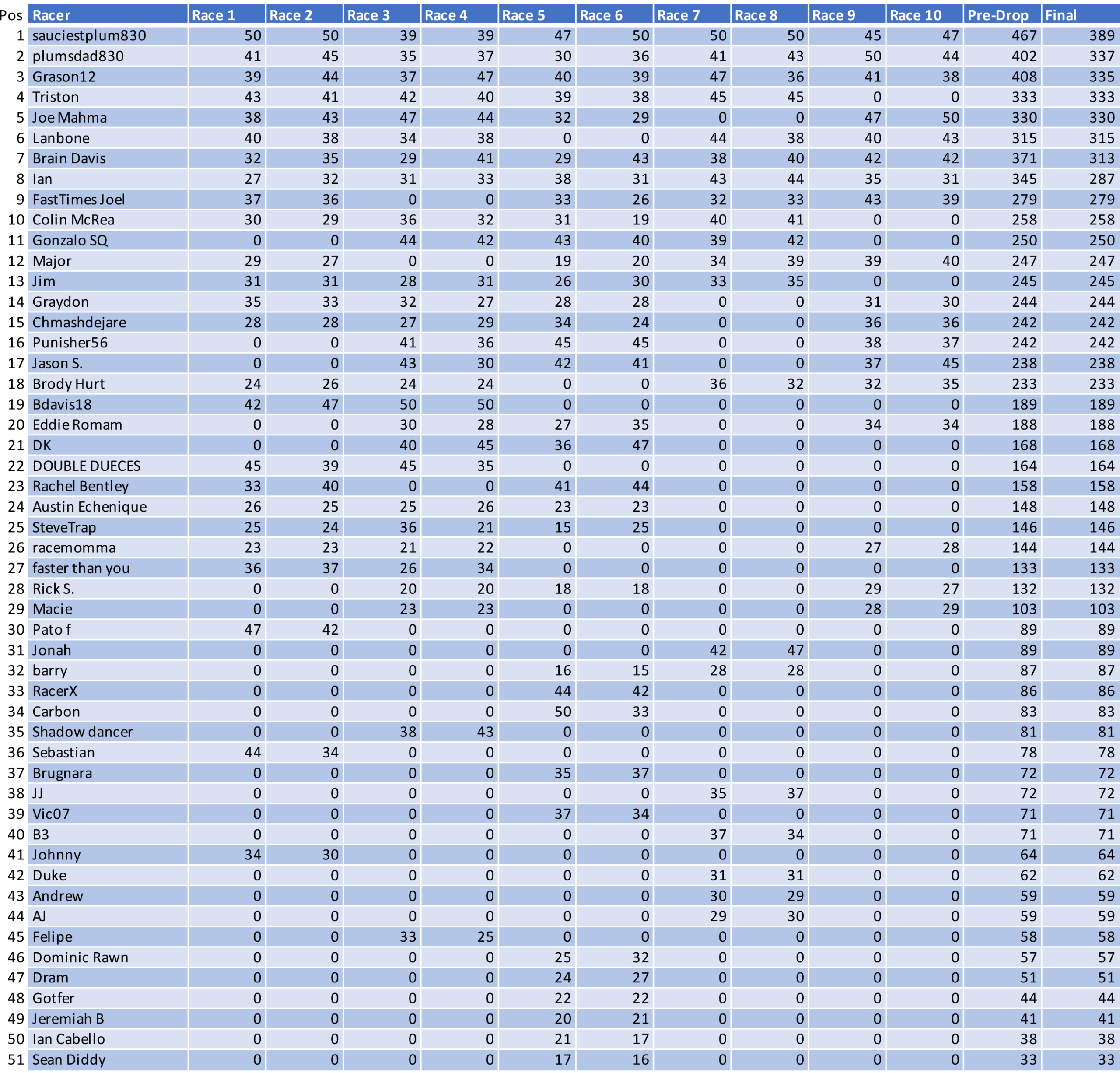 Both Light and Heavy Classes will receive season ending prizes. Drivers will count their best 8 out of the 10 races towards the championship points.